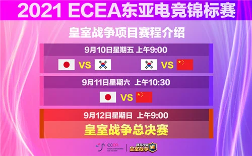 首届ECEA正式项目包括皇室战争、英雄联盟、绝地求生、实况足球,表演赛项目为地下城与勇士,除英雄联盟为三国共同推举外,其他项目由各国分别举荐。皇室战争不但是唯一入选首届ECEA的手游,更是由中国推选举荐的重点冲金项目。这也是皇室战争在连续入选2018雅加达亚运会电竞表演赛、2019西安WCG世界电子竞技大赛后,又一次受到大型电竞赛事的青睐,这款已经诞生5年的经典手游,依然是经久不衰、活力无限。ECEA皇室战争战争项目将在9月10日—12日三天的上午进行,赛制为皇室战争经典的团队赛模式,比赛将在虎牙直播皇室战争官方直播间全程直播,让我们见证中国代表队冲击金牌!