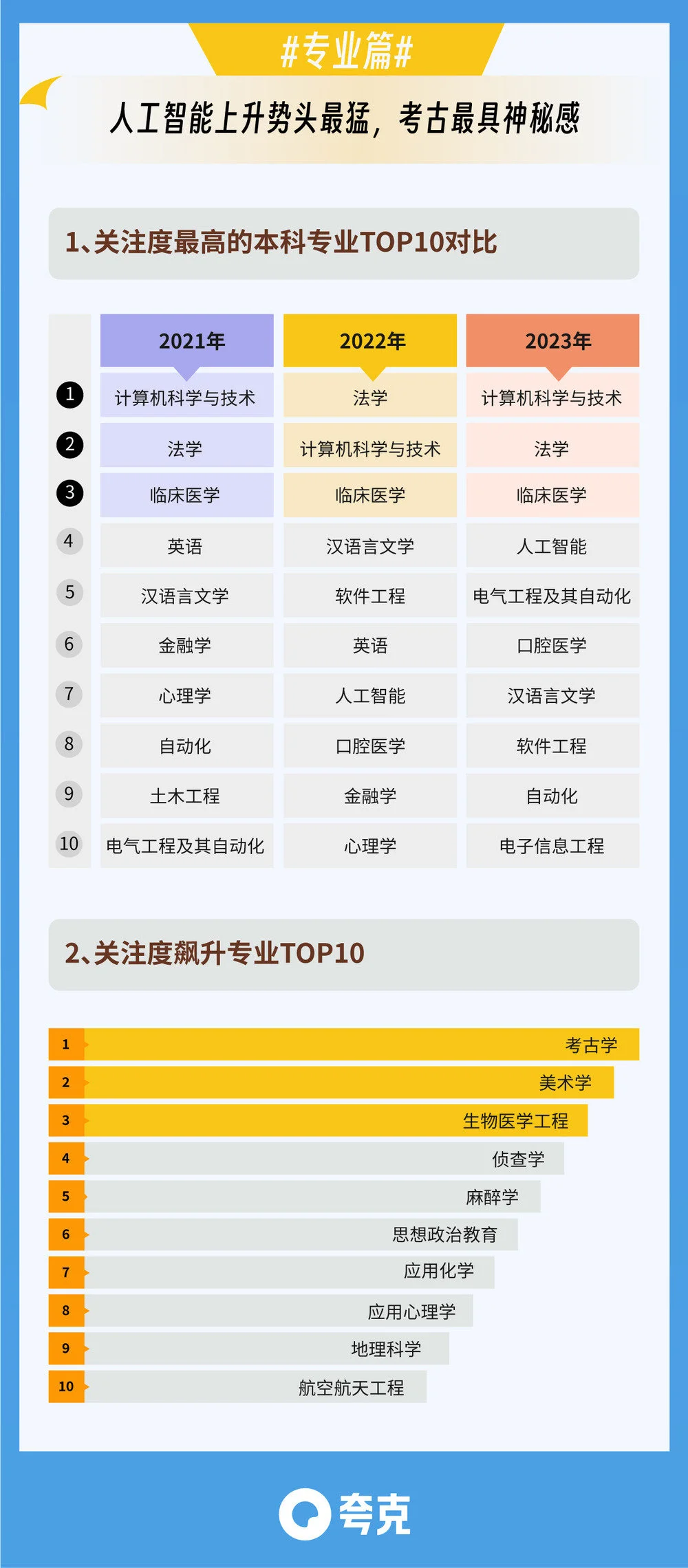 在本科热门专业中,计算机科学与技术、法学、临床医学三个传统热门专业依旧牢牢占据前三。随着大模型、生成式AI的火爆,与人工智能相关的专业上升势头最猛。除了这些大热专业,包括考古、美术学、生物医学工程等小众专业也走进了考生们的视野中,把爱好和专业相结合也许是05后的新思路。