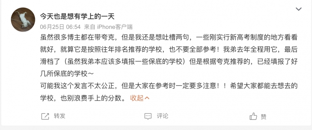 有网友表示:虽然很多博主都在带夸克,但是我还是想吐槽两句,一些刚实行新高考制度的地方看看就好,就算它是按照往年排名推荐的学校,也不要全部参考!我弟去年全程用它,最后滑档了 (虽然我弟本应该多填报一些保底的学校) 但是根据夸克推荐的,已经填报了好几所保底的学校~可能我这个发言不太公正,但是大家在参考时一定要多注意!!希望大家都能去想去的学校,也别浪费手上的分数。