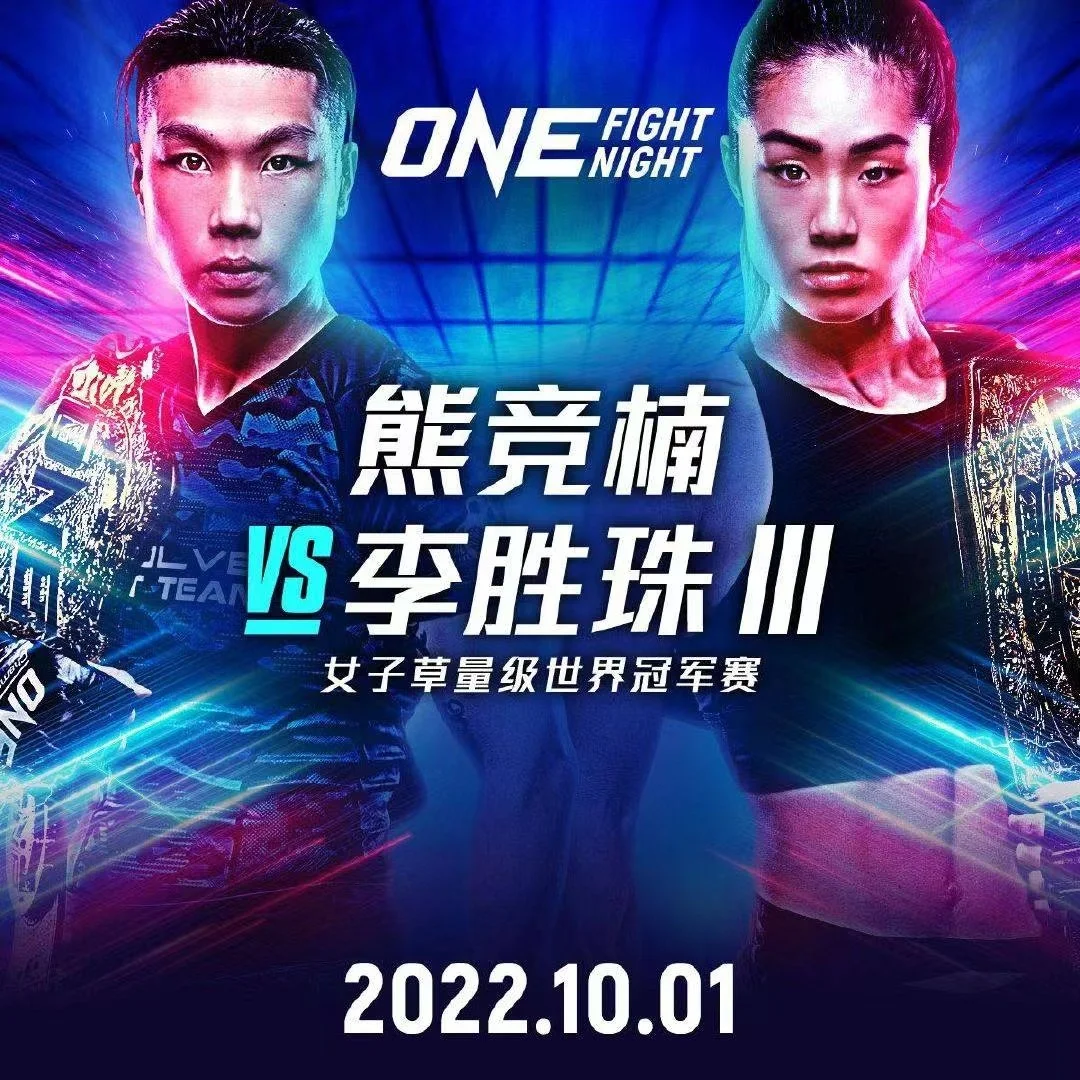 国际知名体育IP-ONE冠军赛将于10月1日举办ONE格斗夜2大型赛事。本次赛事中,来自中国的草量级世界冠军熊竞楠将迎来老对手原子量级世界冠军李胜珠(Angela Lee)的跨级挑战,这也将是两人的三番战。同时,羽量级踢拳世界冠军苏波邦(Superbon Singha Mawynn)也将迎来世界八人赛冠军钦吉兹·阿拉佐夫(Chingiz Allazov)的挑战。另外,在本次赛事中ONE冠军赛首位降服缠斗世界冠军也将被决出,两位冠军争夺者分别是“柔术神童”米奇·穆苏梅奇(Mikey Musumeci)与克莱伯·索萨(Cleber Sousa)。