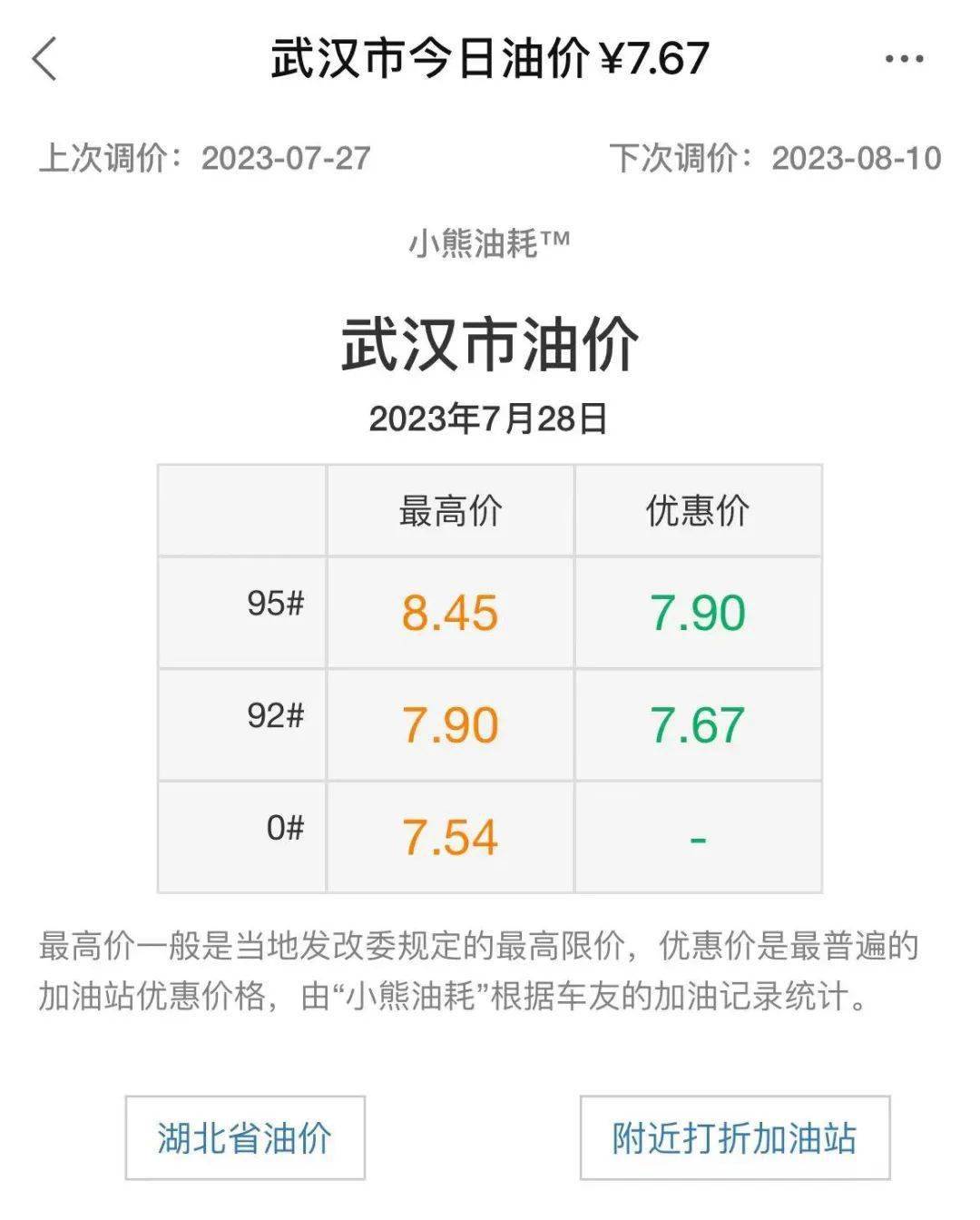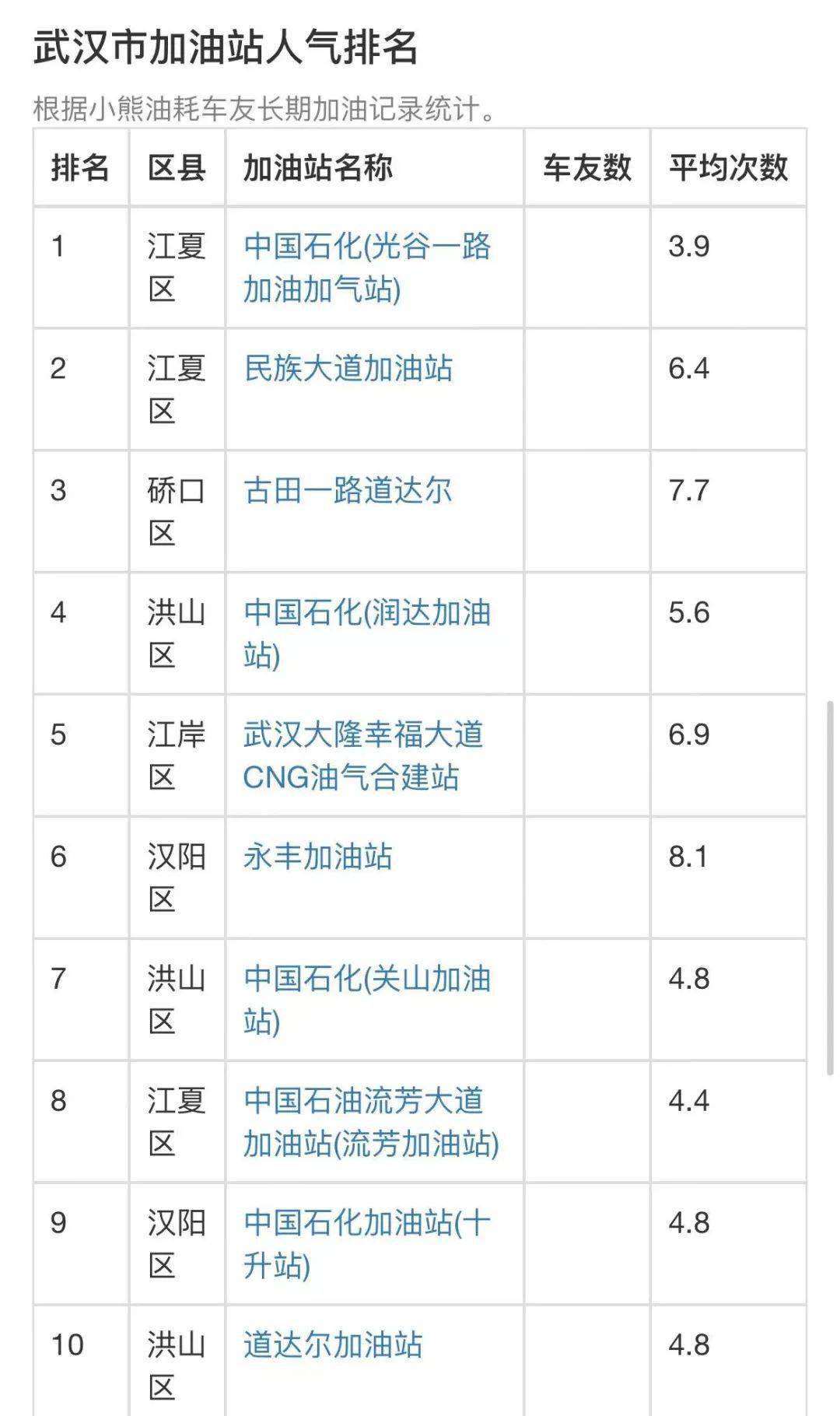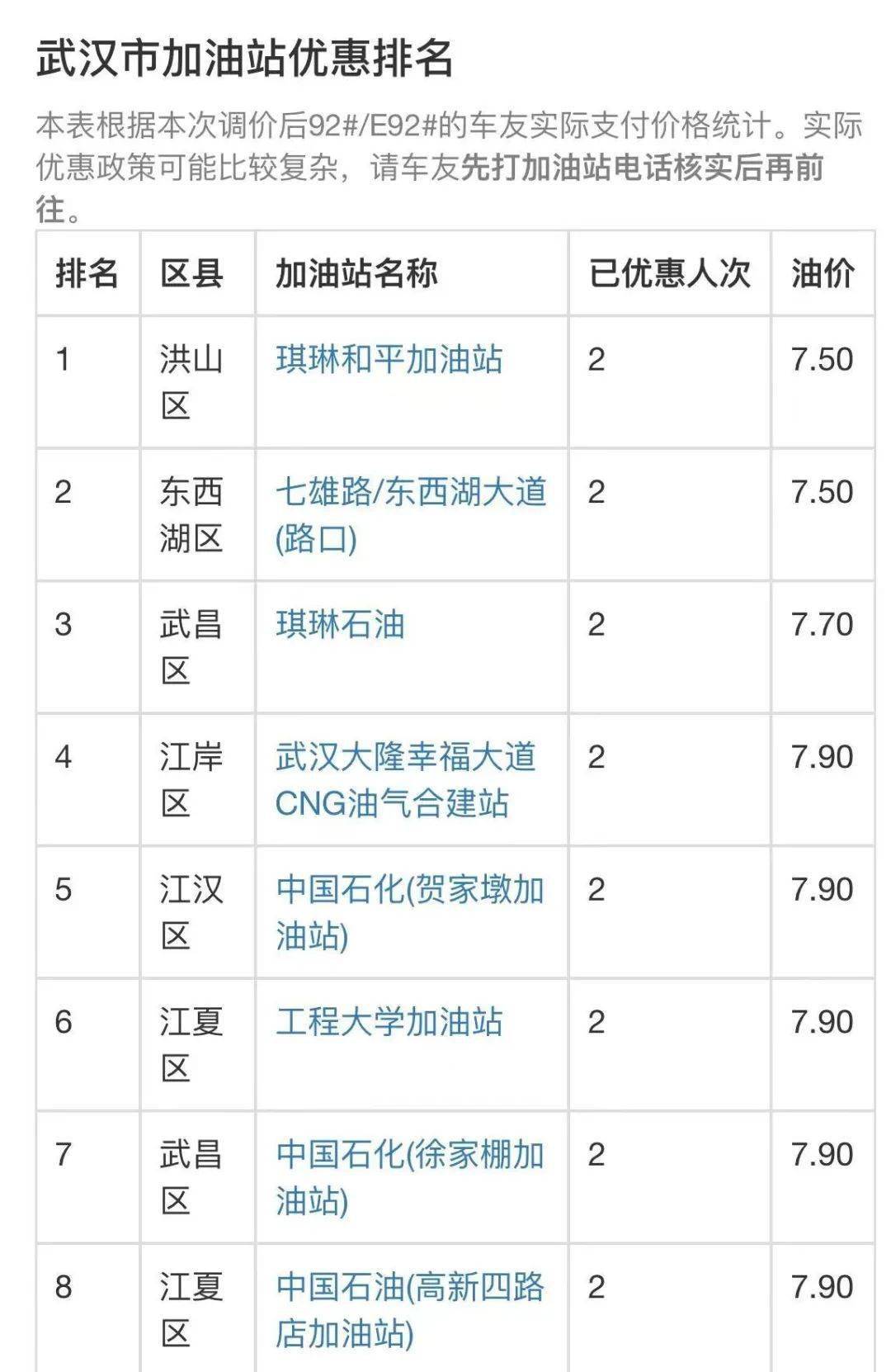 在此功能中,您可以看到“武汉市今日油价”、“武汉市加油站优惠排名”以及“武汉市加油站人气排名”