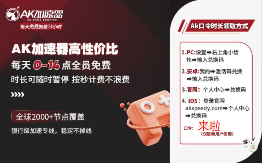 AK每天00:00~14:00免费加速,使用兑换码【来啦】领取至少48小时可暂停加速时长!