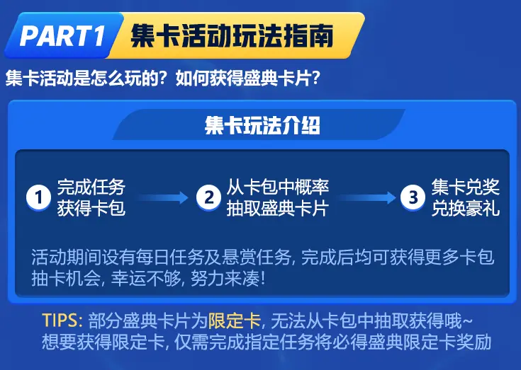 活动的玩法比较简单,只要玩家按照攻略进行就可以了,需要一定的时间才能完成,比如集卡活动,玩家只需要完成任务,就可以获得卡包,然后从卡包中抽取盛典卡片,最后集卡兑换礼物。值得一提的是,其中有一些限定卡,是卡包中无法获取的,所以玩家必须完成指定的任务,才能获得想要的限定卡。