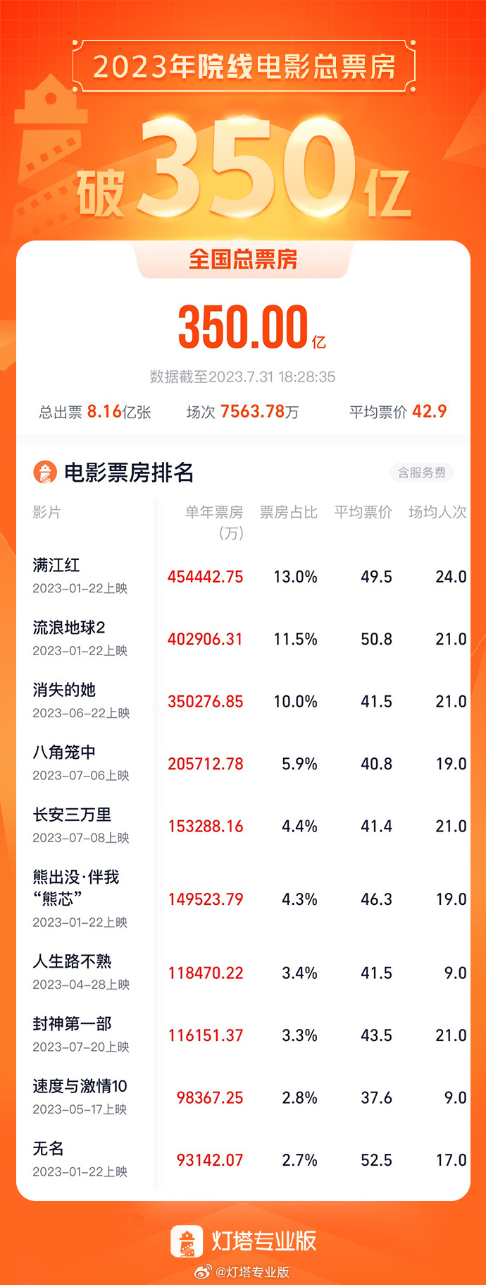 2023年度票房突破350亿 《八角笼中》成为7月票房冠军(电影八角笼有第二部吗)