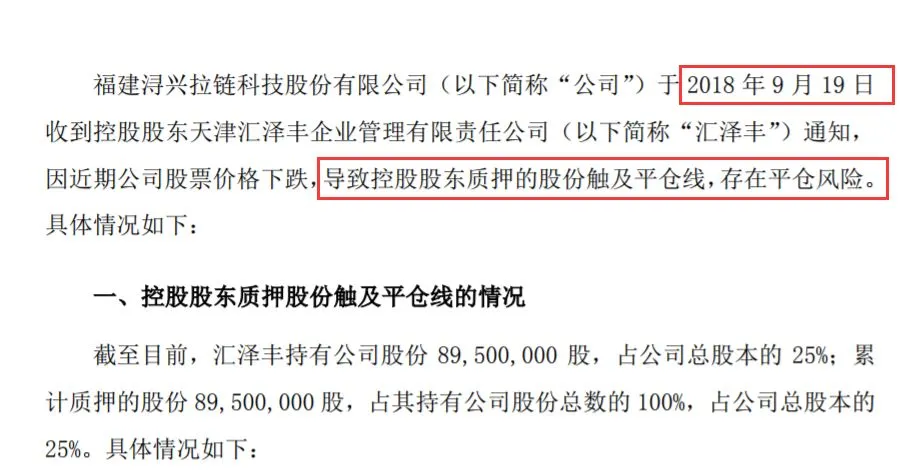 期间,浔兴股份于2018年9月20日公告,“因近期公司股票价格下跌,导致控股股东质押的股份触及平仓线,存在平仓风险。”彼时公告日的收盘价为7.64元/股。