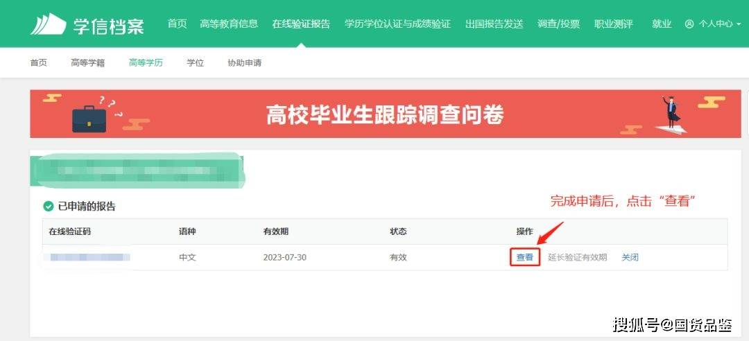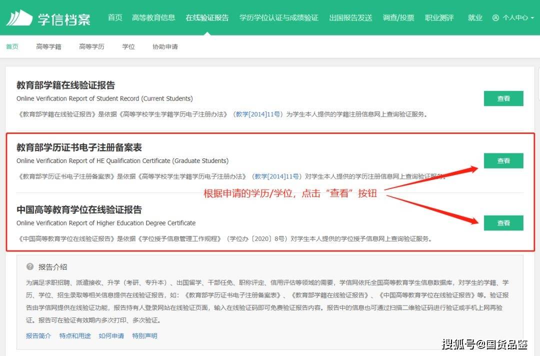 5.根据申请的学历/学位,点击“教育部学历证书电子注册备案表”或“中国高等教育学位在线验证报告”栏目的“查看”按钮。