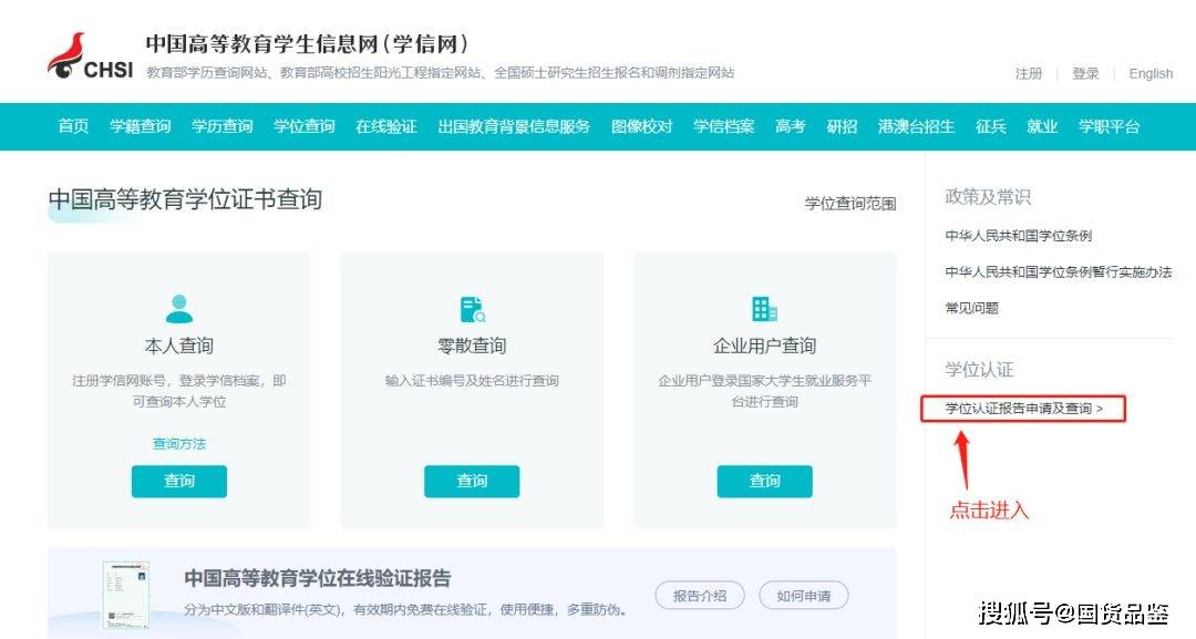 3.点击“学位认证”下的“学位认证报告申请及查询”。