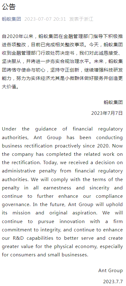 蚂蚁集团7日发布公告:自2020年以来,蚂蚁集团在金融管理部门指导下积极推进各项整改,目前已完成相关整改事项。今天,蚂蚁集团收到金融管理部门行政处罚决定书,我们对此诚恳接受、坚决服从,并将进一步夯实合规治理水平。未来,蚂蚁集团将恪守使命与初心,坚持守正创新,继续增强科技研发能力,努力为实体经济尤其是小微群体做好服务并创造更大价值。