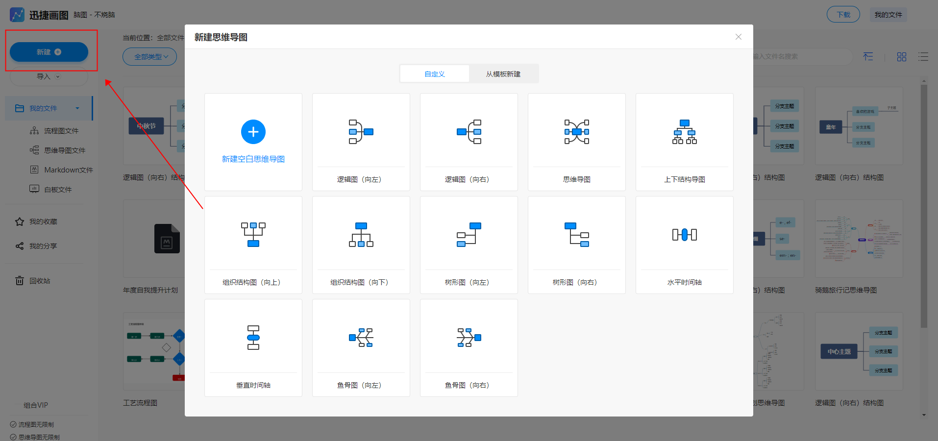 登录迅捷画图并单击“新建”按钮。选择“思维导图”选项,然后选择一个模板,就可以进入制作页面了。