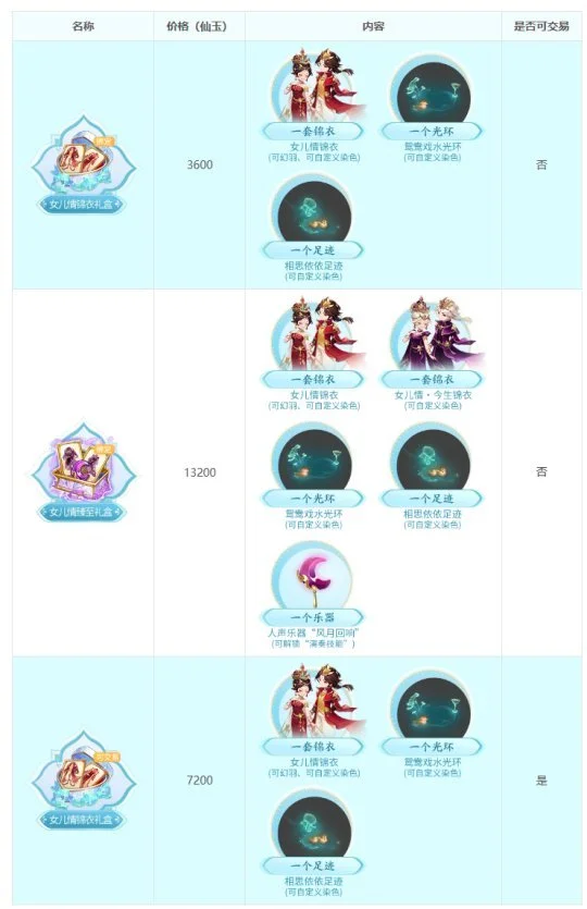 本次女儿情锦衣的购买方案共计三种,其中女儿情绑定锦衣礼盒售价3600仙玉,非绑定锦衣礼盒售价7200仙玉,女儿情臻至礼盒售价13200仙玉,少侠们可以根据自身需要选择对应款式进行选购。