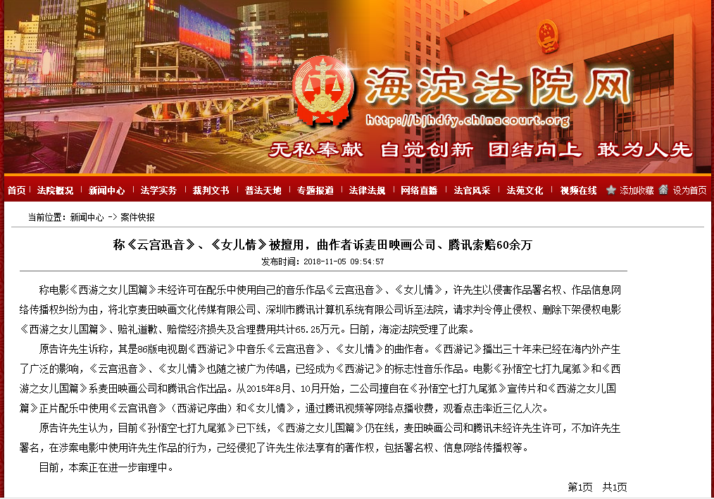 据海淀法院网官网显示,电影《西游之女儿国篇》未经许可在配乐中使用自己的音乐作品《云宫迅音》、《女儿情》,许先生以侵害作品署名权、作品信息网络传播权纠纷为由,将北京麦田映画文化传媒有限公司、深圳市腾讯计算机系统有限公司诉至法院,请求判令停止侵权、删除下架侵权电影《西游之女儿国篇》、赔礼道歉、赔偿经济损失及合理费用共计65.25万元。日前,海淀法院受理了此案。