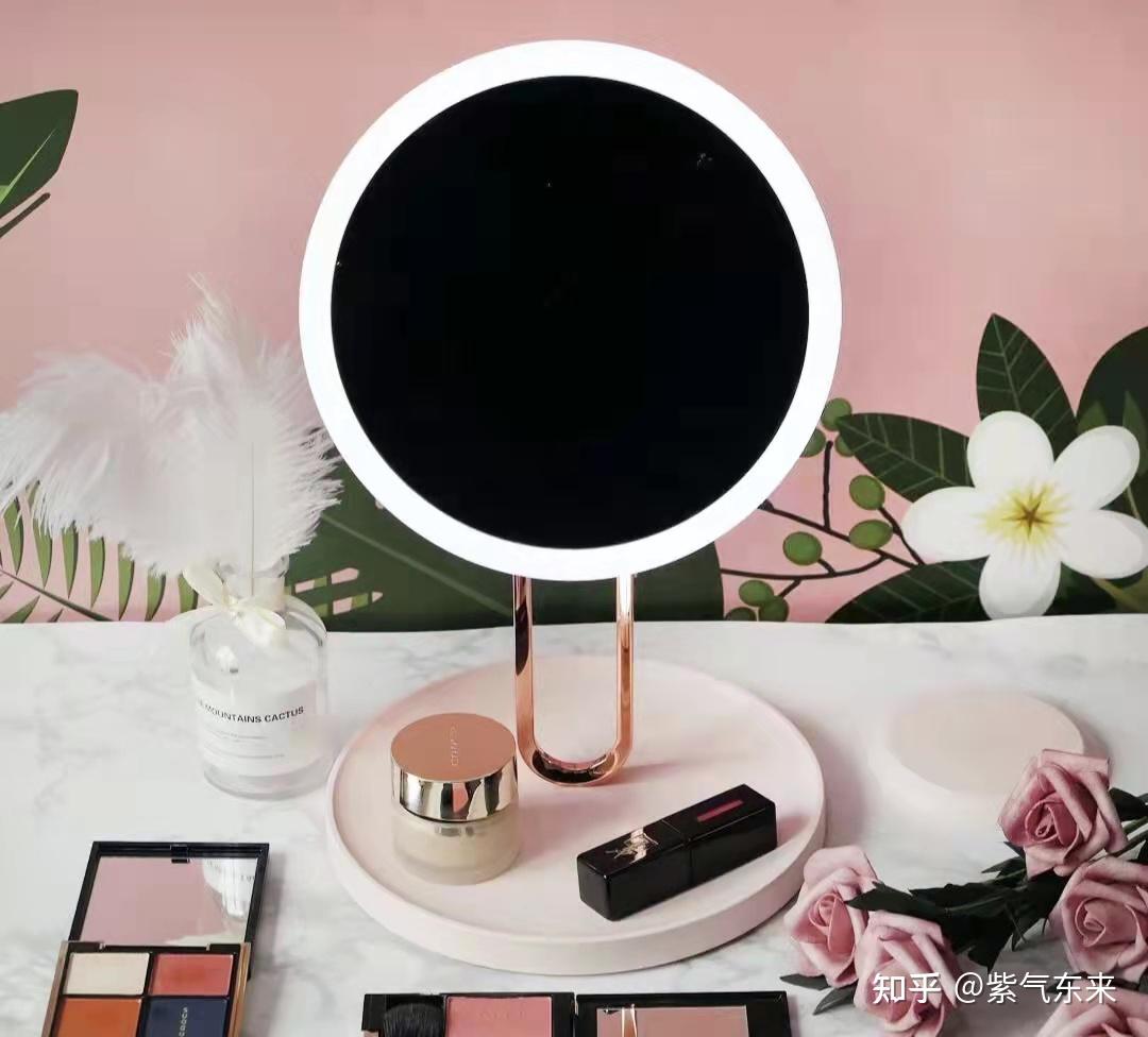支架是u型玫瑰金的,优雅美观,可以悬挂也可放置到底座上,配套底座占地面积大很稳固,你不掀桌子它是不会倒的。这里底座被巧妙地设计成了一个置物台,平时可以在上面放化妆品,四舍五入相当于不占地方哈哈。充电式可以随意移动,不用局限在插座旁边。