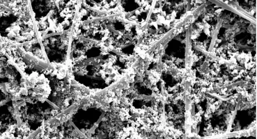 我们肉眼可见的只是滤网的颜色变黑,当这些报废的滤网放大千百倍之后,我们才能看到被滤网阻隔的污染物的真面目,下面这张图就是脏的滤网纤维上的PM2.5颗粒物: