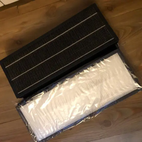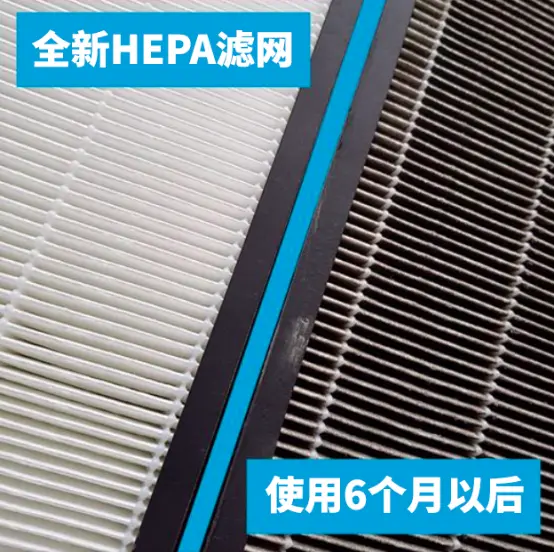 下面的图片是新的和旧的F7中效滤网和HEPA滤网,右边的滤网用了6个月,F7已经需要更换,HEPA高效滤网还可以继续用一段时间: