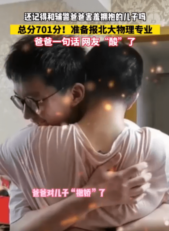 浙江海宁,高考结束后,执勤辅警苏俊良在考场外和儿子温情拥抱。儿子高考701分,准备报考北大物理专业。爸爸苏俊良介绍,平时工作忙,儿子很少让他操心,全靠自己自觉。