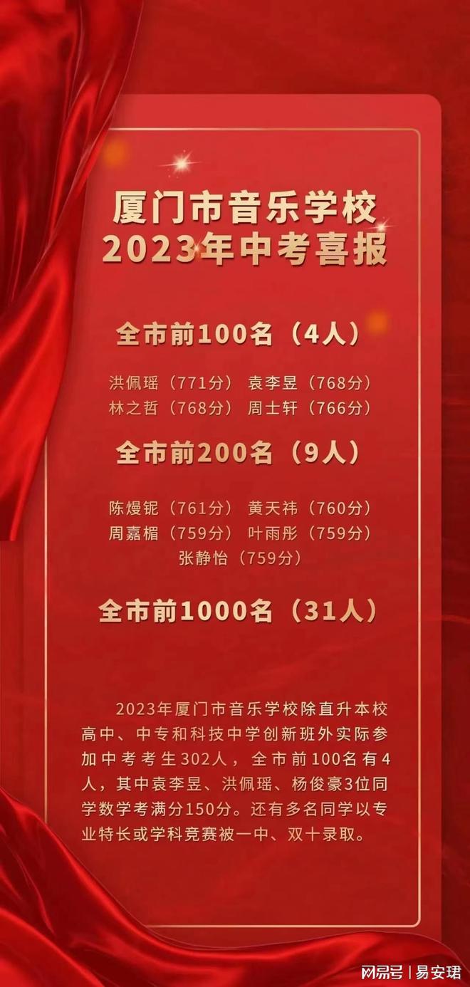 2023年厦门市音乐学校除直升本校高中、中专和科技中学创新班外实际参加中考考生302人,全市前100名有4人,其中袁李昱、洪佩瑶、杨俊豪3位同学数学考满分150分。还有多名同学以专业特长或学科竞赛被一中、双十录取。