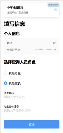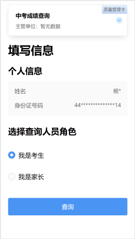 选择查询人员角色,如“我是考生”则点击【查询】即可,如“我是家长”则需填写考生信息查询成绩。
