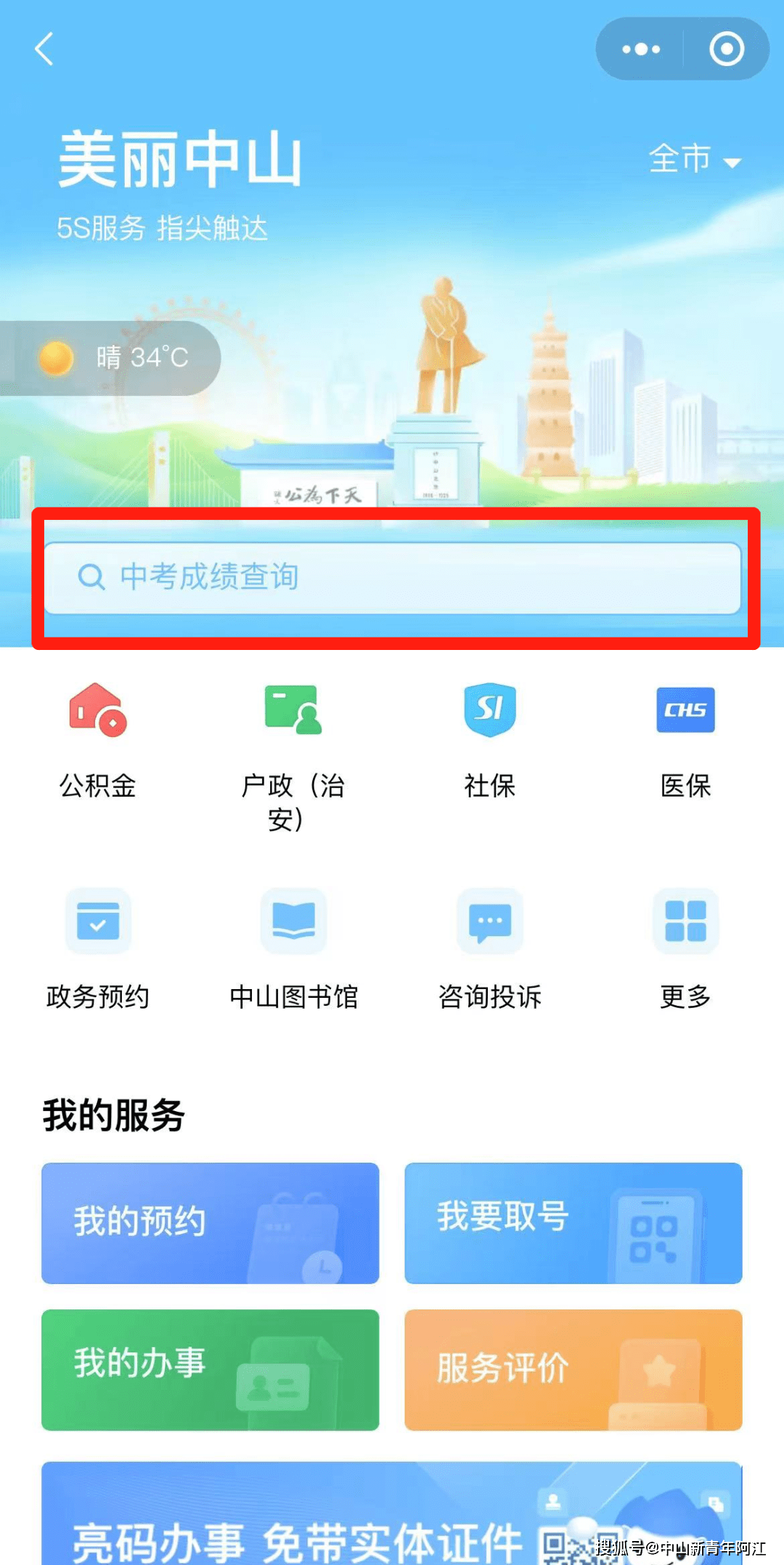 您可以通过微信搜索“粤省事”小程序,或打开“粤省事”APP,并将城市定位切换至“中山市”,点击“美丽中山5S指尖触达”,然后在“美丽中山”专区搜索框输入“中考成绩查询”。