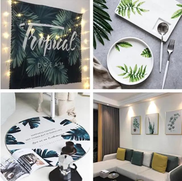 烂大街的树叶元素,成为各种出租屋改造的晒图必备,重灾区在于——挂画、挂布、餐具、地垫、浴帘等等。