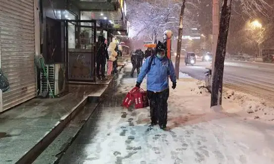 奚国辉出门时,雪已经积了10厘米厚,没过他的脚踝。他刚接到一个来自商超的订单,需要把一些生活用品送到消费者手里。