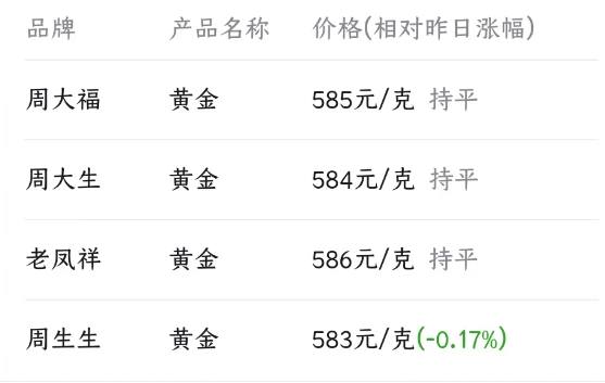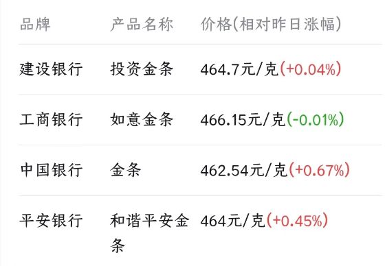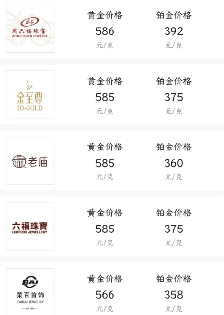 各大品牌金店及银行最新价格见下表,仅供参考: