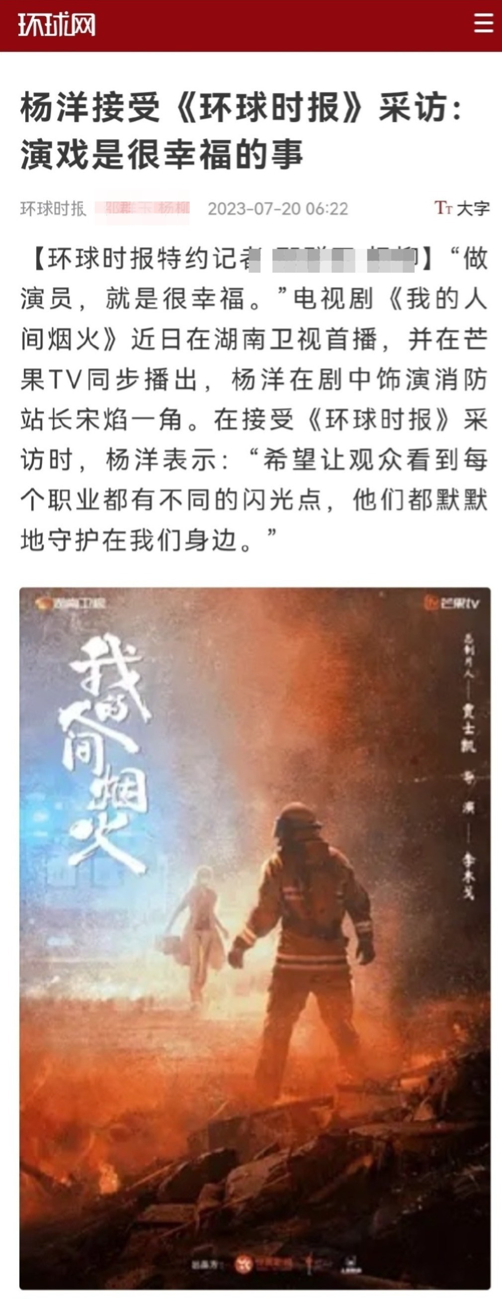 “做演员,就是很幸福。”电视剧《我的人间烟火》近日在湖南卫视首播,并在芒果TV同步播出,杨洋在剧中饰演消防站长宋焰一角。在接受《环球时报》采访时,杨洋表示:“希望让观众看到每个职业都有不同的闪光点,他们都默默地守护在我们身边。”