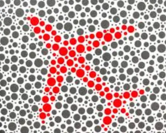 第二张图的内容相比于第一张有了难度的提升,在颜色的选择上使用了比较相近的几种颜色,而且在途中隐藏的并不是常规的数字,而是一架飞机的图案。不过这张图依然难不住正常视觉的人,而对色弱和色盲者来说就相当难了。