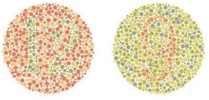 第四张图片,是有两张构成的。一张可以看到数字12,另外一张可以看到数字9。但据说红绿色盲看到的是数字17和0。