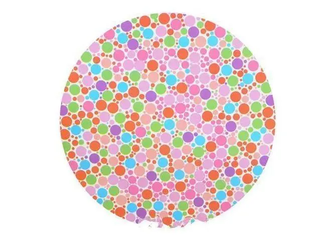 第一张图片,正常人群可能看不到数字,只能看到五彩斑斓的小圆点组合成的图形。但红绿色盲会在上面看到数字45。这个图片辨识程度比较简单。