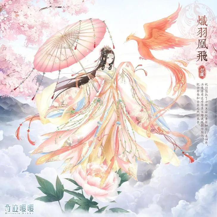 炽羽凰飞属于四神里的一套,所以算是一个古风类的套装,大家都知道古风套装特别考究细节问题,而这套也非常完美的诠释了叠纸对于细节的把控。而且该套给人一种特别舒服的感觉,可能上古的神都穿这样吧。