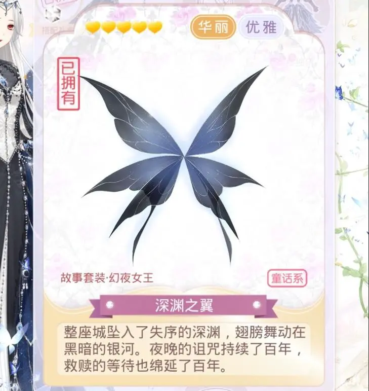 这个套装确实对得起这么多玩家的喜爱,整个套装就两个字“好看”,它没有特别多的部件,但每一个部件都是绝美的,特别是深渊之翼这个黑紫色大翅膀,谁能不爱。