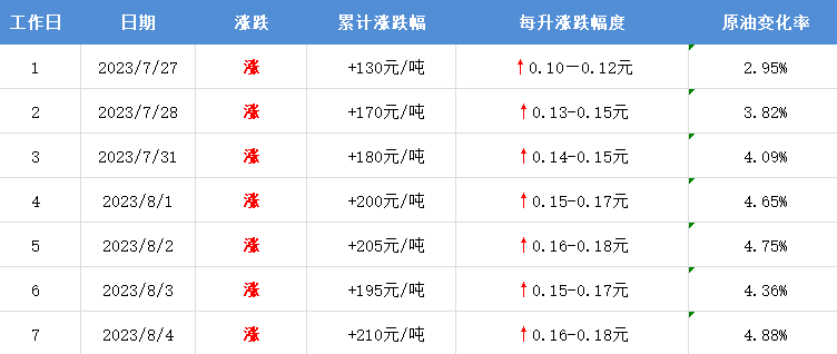 8月4日,本轮油价计价统计周期第7个工作日,当前参考原油变化率为4.88%,预计汽柴油累计上调210元/吨,折算为每升油价上涨0.16-0.18元。