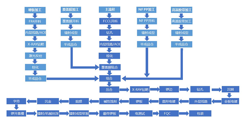 软硬结合板的生产流程工序主要包括准备、硬板制作、软板制作、软硬结合、测试和包装等环节。