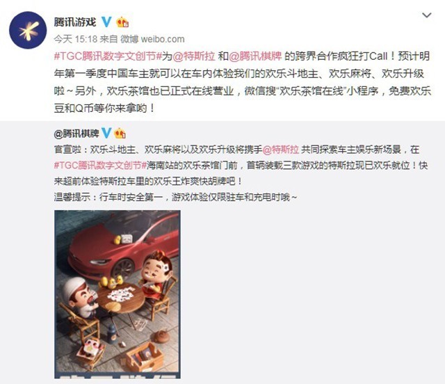中关村在线消息:今日,特斯拉联合腾讯正式宣布将在明年一季度向特斯拉用户通过OTA空中升级推出新的娱乐功能,其中包括腾讯旗下“欢乐斗地主”、“欢乐麻将”、“欢乐升级”三款游戏。