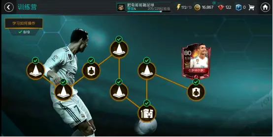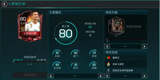 在学会基本操作之后,那就一定要靠球星来强化你的球队,在新手营结束后,官方会送给你C罗作为主力球员,当前分数为80分,我建议大家一定要将他作为核心升级的球员。当通过剧情模式的“冠军之路”,我们就可以把C罗的能力值提升到100点,此时,你自己的球队里,左边锋的位置可以说是完美无缺了。
