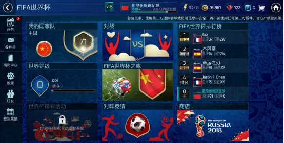 当你的球队总评达到70之后,就可以解锁世界杯模式啦。在世界杯游戏模式中你可以选择一个国家队,每个队伍会有11名球员供你使用。不过笔者发现,不论是选择阿根廷还是巴西,每个国家的能力值都是70分,也就是说,在选择国家队的时候,根据自己喜欢的球队选择就可以了,能力值都是需要后期的训练来提升的。