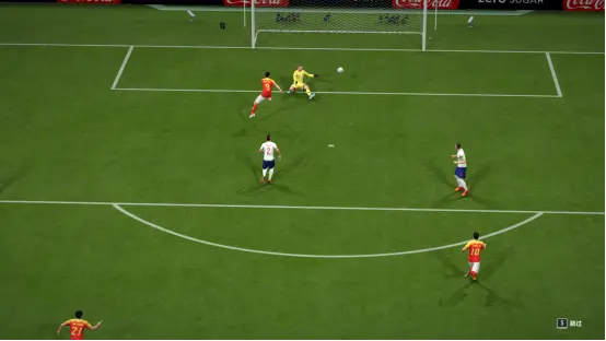 运气好是一部分,主要我有特殊的进球技巧。我习惯“打远角”射门,在杀入禁区后,然后向远角推动左摇杆,大致±45°就足够,之后进行射门。笔者建议大家多试几下,力度控制还是要观察对方门将的站位等,所以笔者认为“打远角”射门是这款游戏中屡试不爽的射门技巧之一。