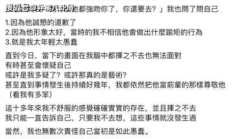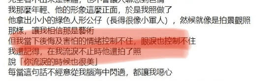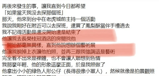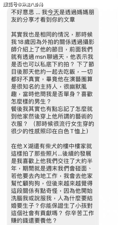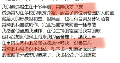 根据她的爆料,她17岁的时候在校友的介绍下认识了这位前辈。