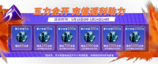 5月18日-24日,五力全开,充值返利助力,充值点券达到对应金额即可额外获得点券返利,最高累计充值1000元,总计赠送10000点券。