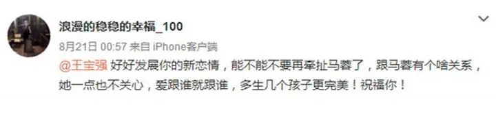 对于王宝强有了新女友一事,马蓉到底是持什么态度,她有没有发声的权力呢?显然她也不是一个糊涂的人,用她朋友的话来讲就是:王宝强有了新欢,马蓉会祝福他,而且这事情跟马蓉也没有一点关系。她一点也不会关心的,王宝强爱跟谁就跟谁,多生几个孩子更完美,祝福你。