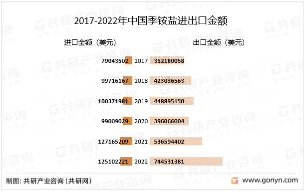 随着公共意识的提高,环保质量的要求,此类产品不断满足社会发展的需求,是未来表面活性剂行业发展的必然方向。其中2022年中国季铵盐出口金额为744531381美元;进口金额为125102221美元。