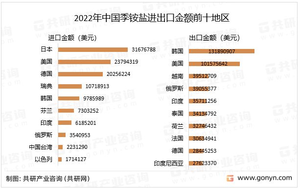 从我国季铵盐进出口地区来看,其中2022年中国季铵盐主要进口金额地区有日本、美国及德国,分别进口金额为31676788美元、23794319美元及20256224美元;季铵盐主要出口金额的地区有韩国、美国及越南,分别出口金额为131890907美元、101575642美元及39512709美元。