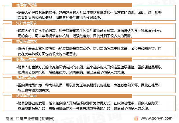 随着人们对健康、养生和美容的需求不断提升,以及雪蛤保健品产业链完整性较强、技术创新持续推进等因素。国家也出台了一系列支持政策和措施,为企业发展提供了必要的保障和支持。