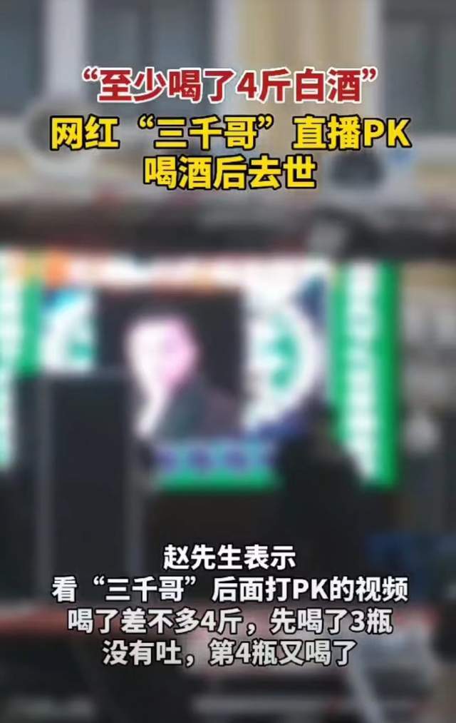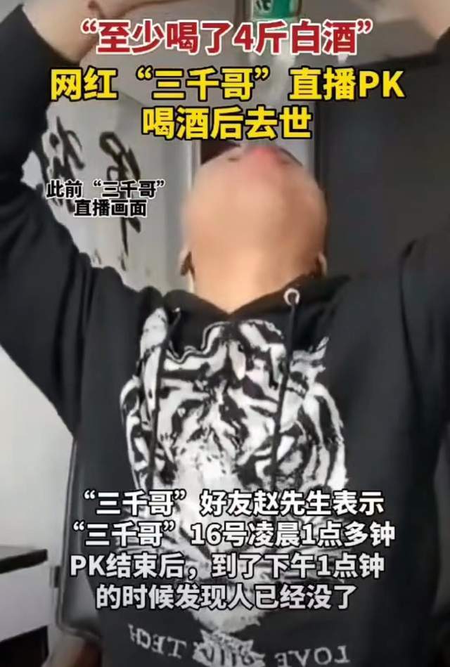 最近,江苏省连云港网红三千哥在直播间PK喝白酒,由于打PK比赛,饮酒过度,不幸离世了。