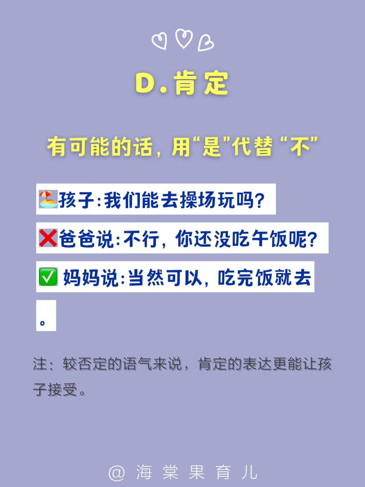 注:较否定的语气来说,肯定的表达更能让孩子接受。