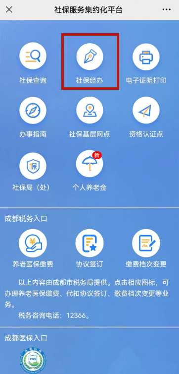 进入成都社保公众号,点击【社保服务】进入社保经办机构
