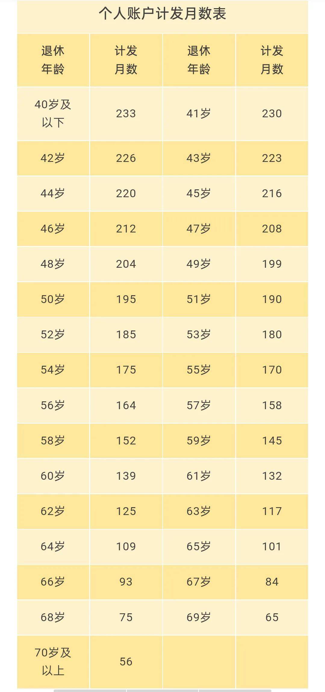 比如:男职工60岁退休,计发月数139个月。女职工生产、服务岗位50岁退休,计发月数为195个月。女职工管理、技术岗位55岁退休,计发月数为170个月。