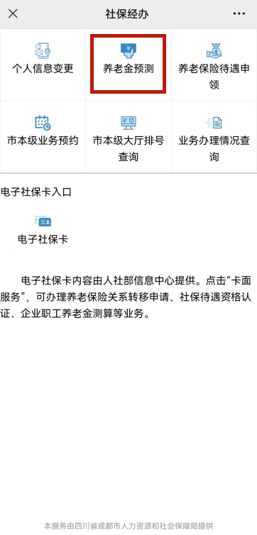 进入后点击【社保经办】,登录后点击【养老金预测】,选择参加工作时间皆可直接算出养老金金额