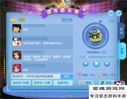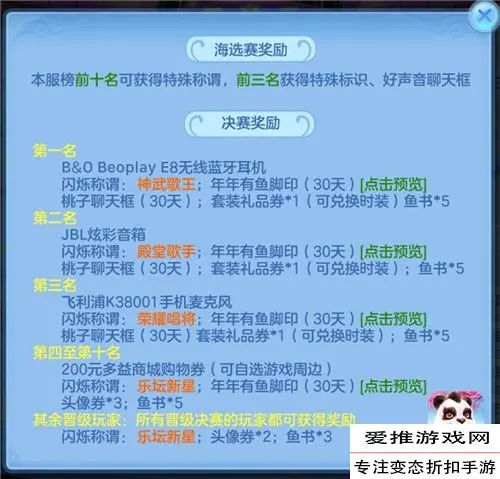 海选投票结束后,自由选曲榜和主题曲榜前100名可以晋级决赛,本服榜单前十名可获得特殊称谓,前三名还将获得特殊标识、好声音聊天框等珍稀奖励。与此同时,海选投票期间,每日19:30至20:00,玩家还可以参与集中投票,《神武3》手游将从这段时间投票的玩家中选出100名幸运少侠赠送音乐秀锦鲤奖。