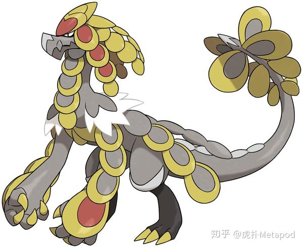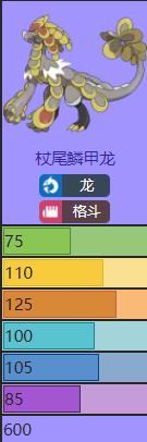 第五世代存在理论中的完美双本打击面【龙+格斗】一直被推迟到第七世代才得以正式登场。然而由于妖精属性的强势,以及自身种族值分配有点水桶腰的问题,杖尾鳞甲龙在太阳/月亮中表现欠佳,在该版本中只有【腹鼓+速度果】这种有些复古的打法能在单打中玩玩,整体来说它确实可能是(特定版本中的)最弱准神。